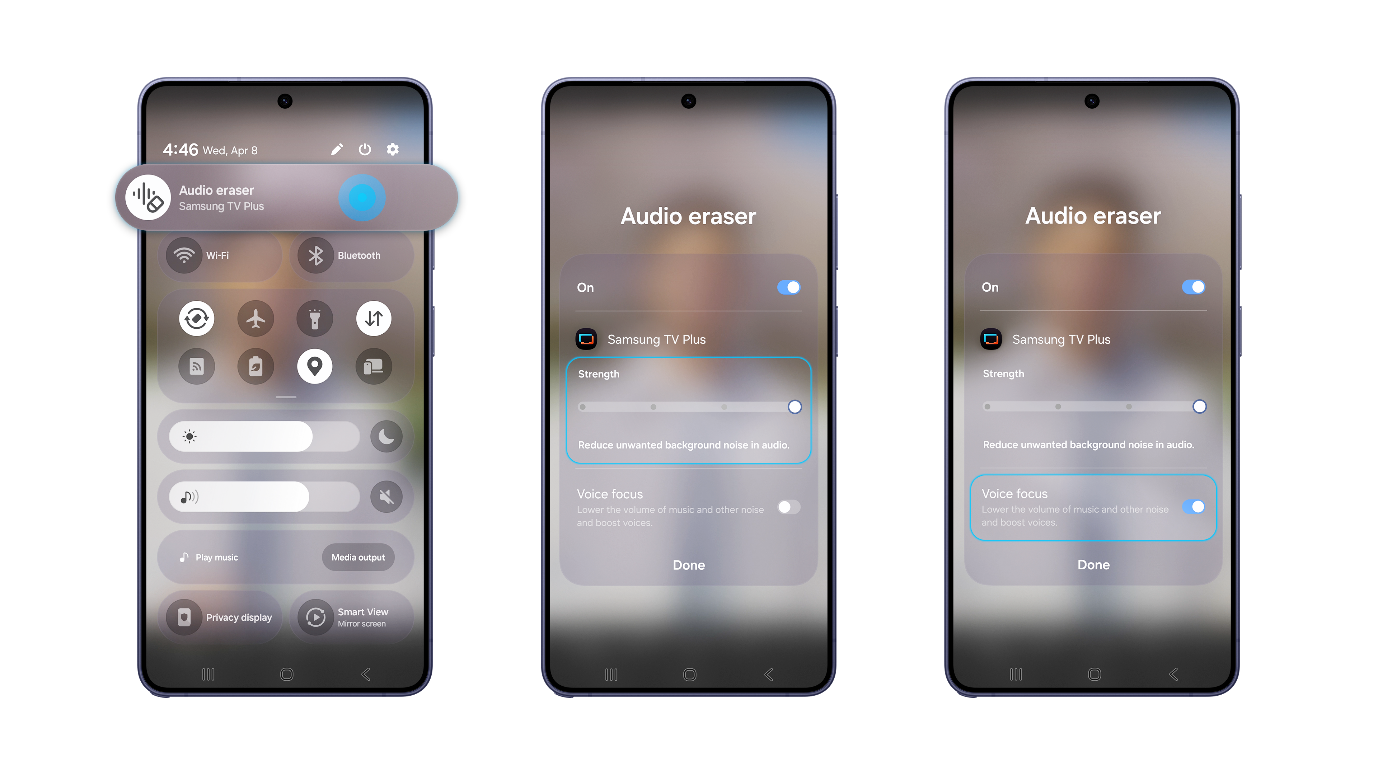 ▲Access Audio Eraser via the Quick panel on the Galaxy S26 series, with controls to adjust “Strength” and enable “Voice focus.”[3]