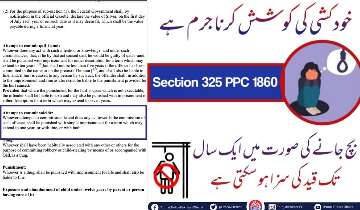 An attempt to commit suicide is a crime u/s 325 of Pakistan penal code, surprisingly, instead of providing counseling and psychological help to the victims of mental health issues and as a result of that a suicidal attempt, our law wants them to be punished for it. https://t.co/6djPa54mem