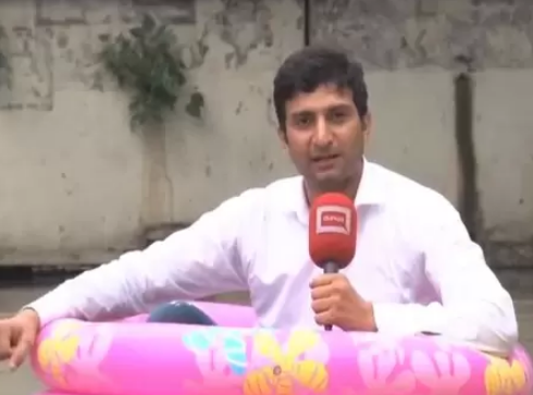 One reporter tried to convey the message that the streets of Lahore are swamped with too much water in a rather innovative way