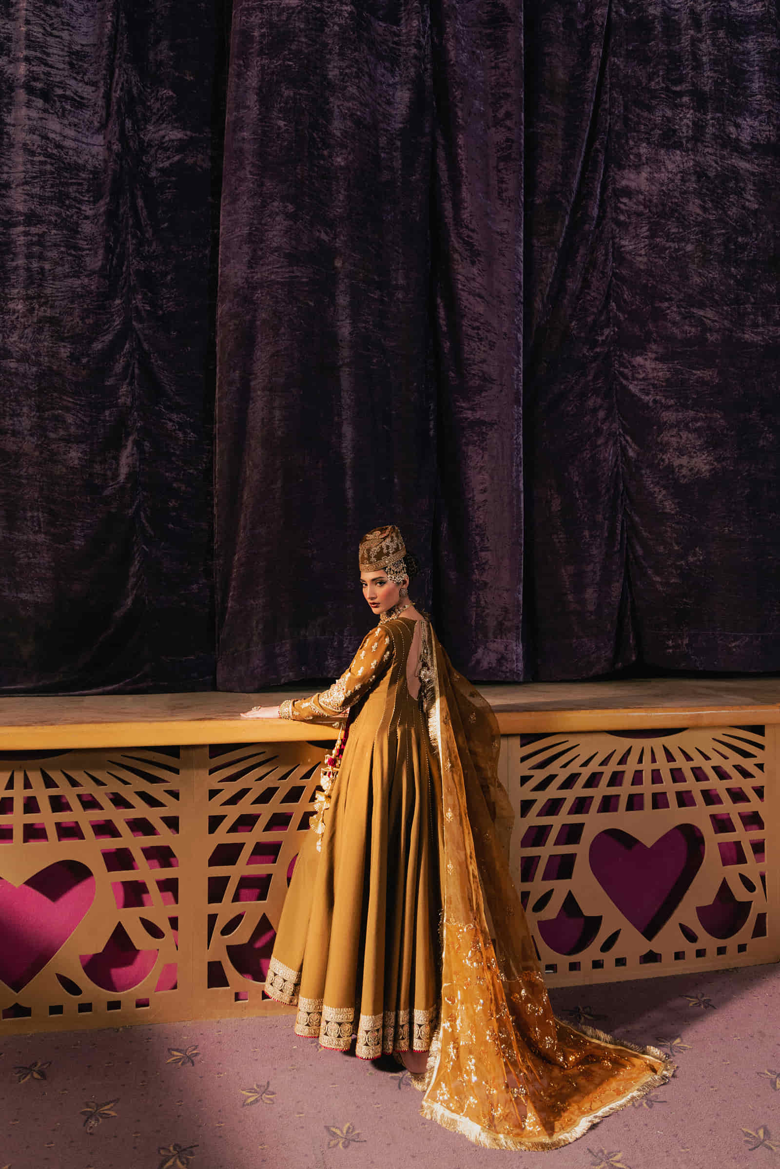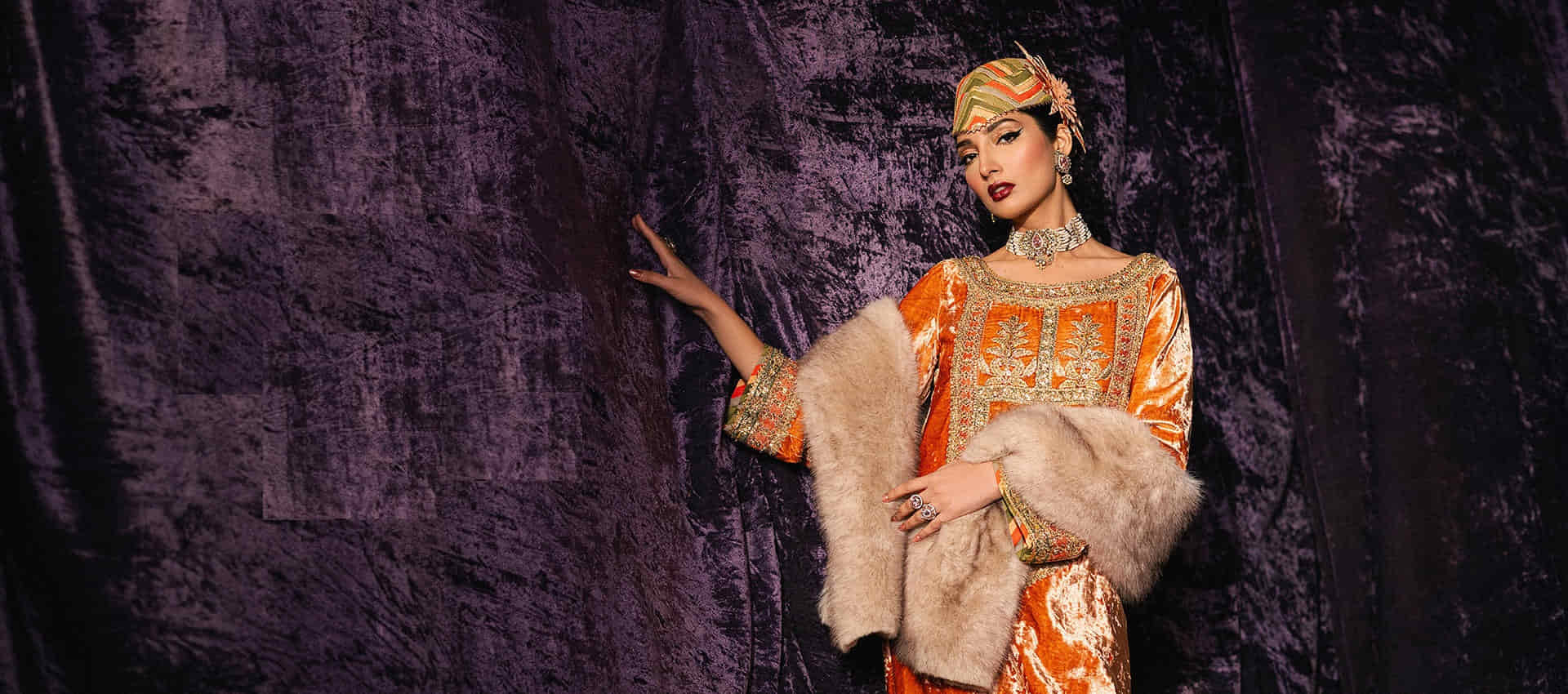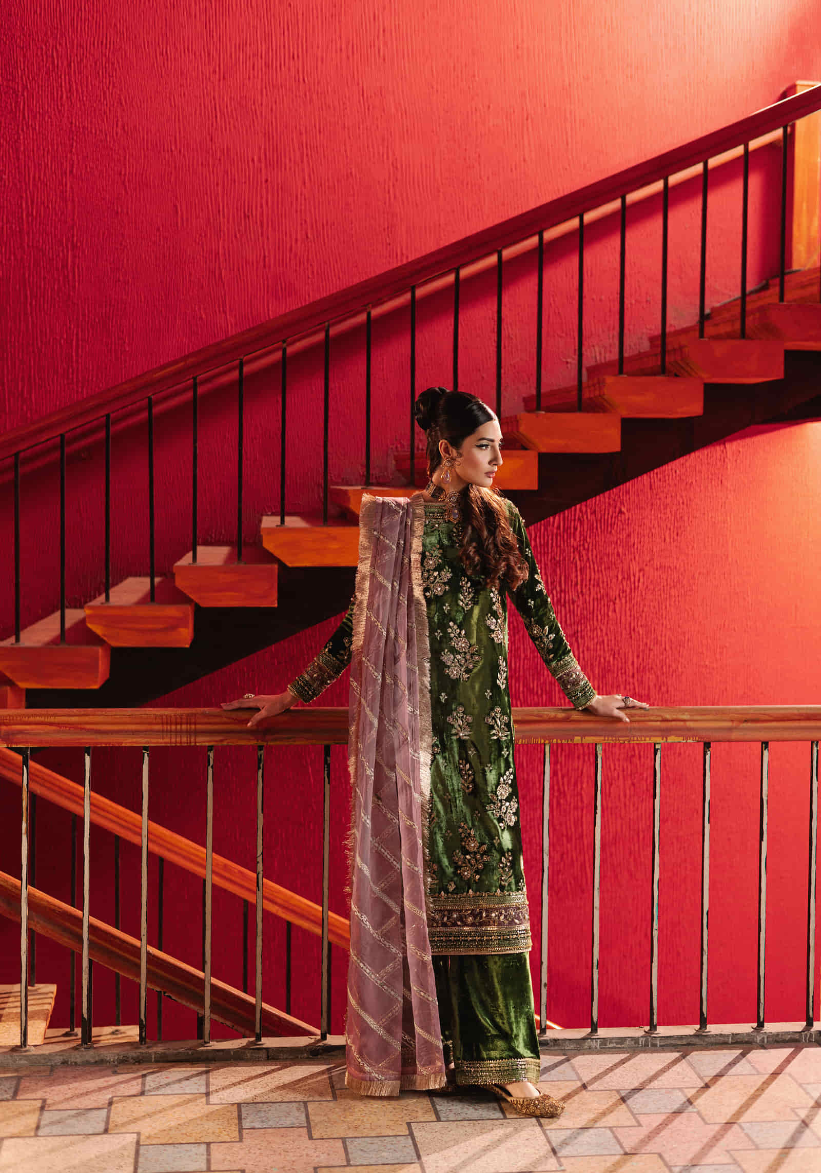 At the heart of ‘Roxy Cinema’ lies a mesmerizing play of textures and tones. Luxurious velvets in deep jewel shades—emerald, sapphire, and ruby—set the stage for intricate gold embroidery. Adorned with shimmering beadwork and sequins, these ensembles reflect the grandeur of Lollywood’s leading ladies, whose bold style still inspires awe. The collection is completed with airy organza dupattas, providing an ethereal counterbalance to the richness of the designs.