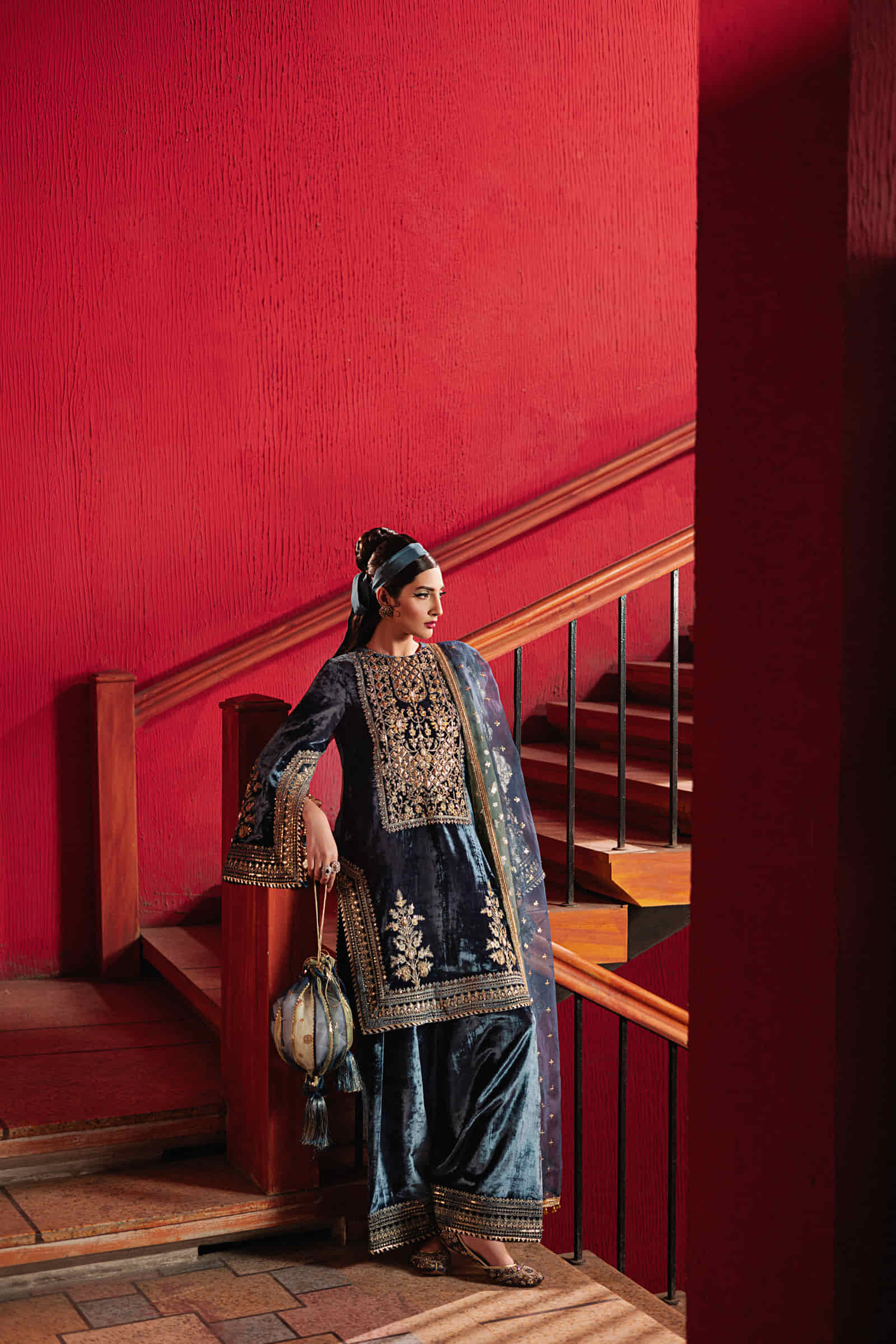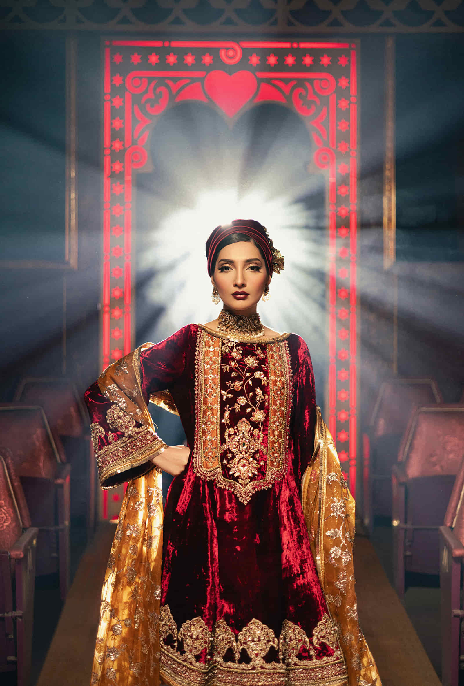 At the heart of ‘Roxy Cinema’ lies a mesmerizing play of textures and tones. Luxurious velvets in deep jewel shades—emerald, sapphire, and ruby—set the stage for intricate gold embroidery. Adorned with shimmering beadwork and sequins, these ensembles reflect the grandeur of Lollywood’s leading ladies, whose bold style still inspires awe. The collection is completed with airy organza dupattas, providing an ethereal counterbalance to the richness of the designs.