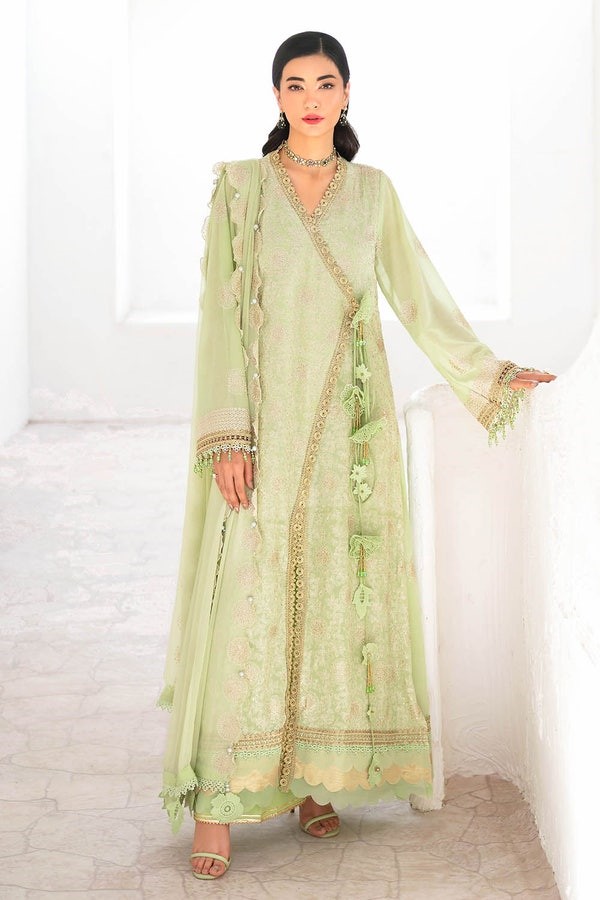 Swiss voile? Say less. This pastel green 3 piece unstitched embroidered suit is sophisticated and soft, with intricate embroidery that adds just the right amount of drama. A top pick for a formal family affair.