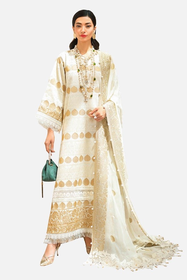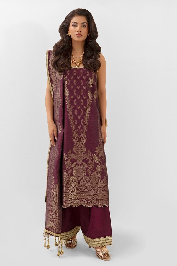 Modern cuts meet tradition in this striking unstitched 3 piece jacquard suit. If your Eid involves a little glam and a lot of presence, this one’s your statement starter.