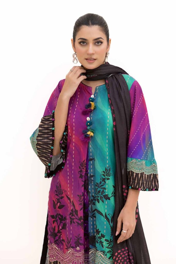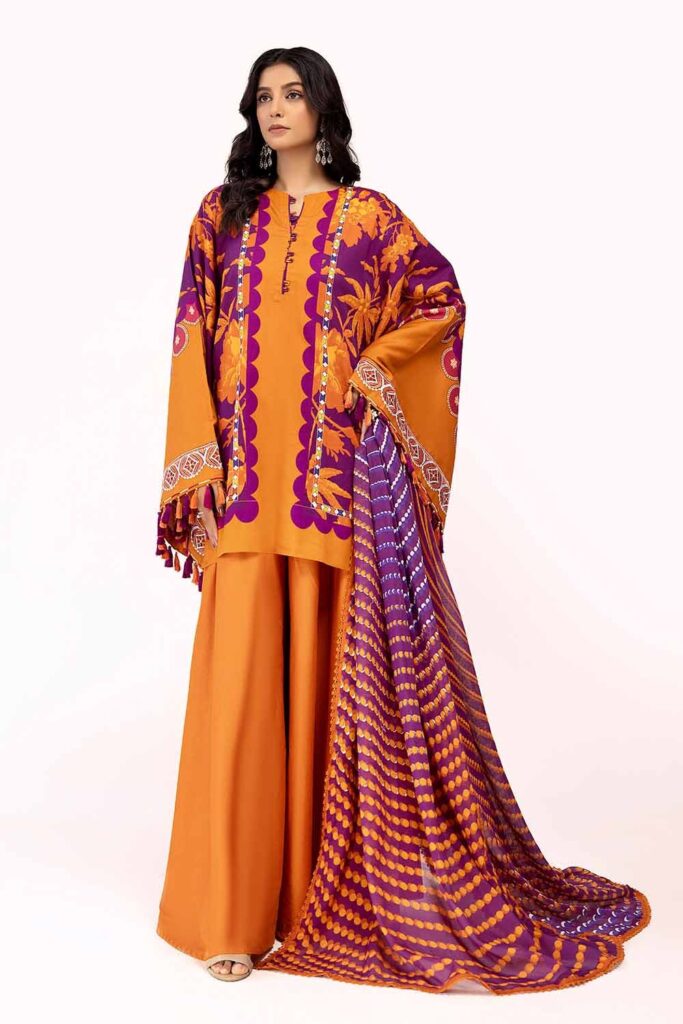 Linen in winter? Absolutely! The slightly heavier linen fabric in GulAhmed’s collection provides just the right amount of warmth while still being breathable. This printed one piece is a must-have for those mild winter days when you want to look stylish but don’t need a heavy fabric. The bold digital print is perfect for adding a splash of color to your winter ensemble.